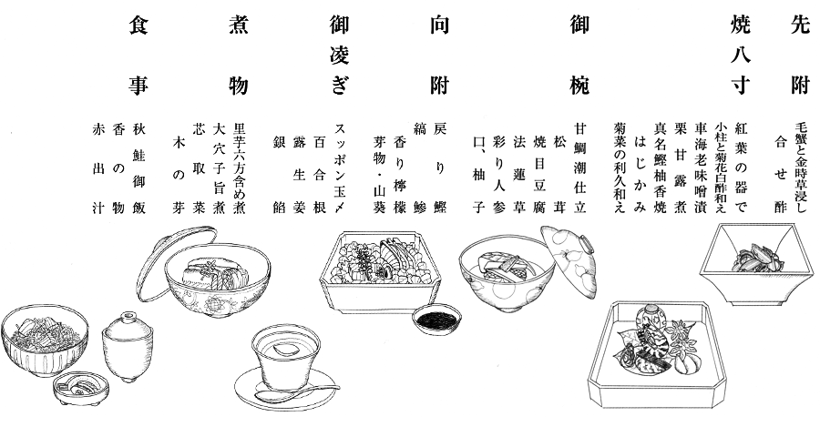 - 小柱は酒煎りします。菊花はむしり、酢を入れた湯で茹でて氷水に落とし、吸地にて地漬けした後、水気を取ります。白酢衣は、豆腐650g、砂糖60g、塩6g、味の素2g、酢68g、薄口醤油13g、当り胡麻ペースト13gで合わせ和えます。