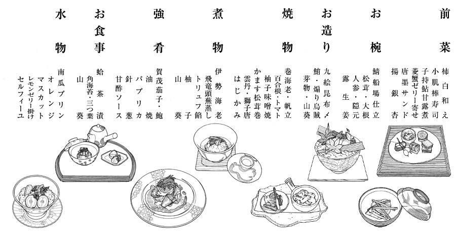 - 鯖はおろして中骨と共に塩をします。大根は鏡に、人参・隠元は帯に庖丁します。鯖をコロに庖丁して焼き、あらで出汁を取り、鰹出汁と合わせて吸出汁とし、松茸と合わせて露生姜を落とし供します。