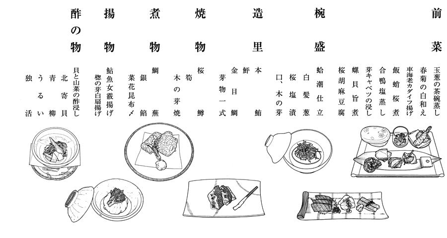 - うるいは色よく湯がき、独活は拍子木切りにして共に食い味の塩水につけます。後、彩り良く盛り付け、山葵酢で供します。