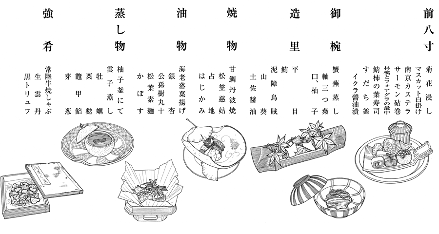 - 甘鯛は水洗いし、三枚におろして上身とします。適量を切り出し、塩を当てた後、西京床に1日漬けます。栗は渋皮つきと渋皮なしの二種類を用意します。渋皮を付けたままの栗は重曹を入れ、水から火にかけて2回茹でこぼし、水に晒し、筋を掃除します。後、蒸して裏漉しします。もう一方は皮を剥き蒸し裏漉しします。それぞれを塩・薄口醤油・メイプルシロップにて調味します。甘鯛を西京床から上げ、串を打ち焼きます。八分ほど火が入ったら先の栗を小田巻に二種類を入れ、甘鯛に絞りかけ、上火にて焼き上げます。慈姑は松笠に庖丁し、吸い地八方で含ませた後、上新粉にて揚げます。占地は適量に庖丁し、吸い地で焚きます。薑(はじかみ)は掃除しさっと茹で、陸上げして塩を当てた後、甘酢に落とします。